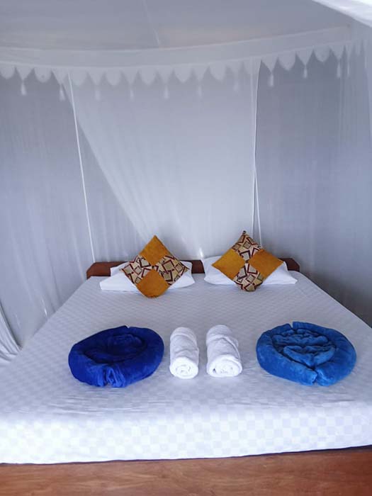 Bedrooms sleep two people on raised beds, and pillows, bolsters, sheets and mosquito nets are supplied. Extra mattresses can be provided if required. Both bungalows have power outlets for charging devices and bedroom light switches.