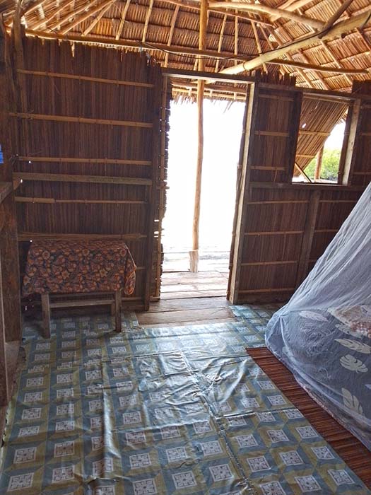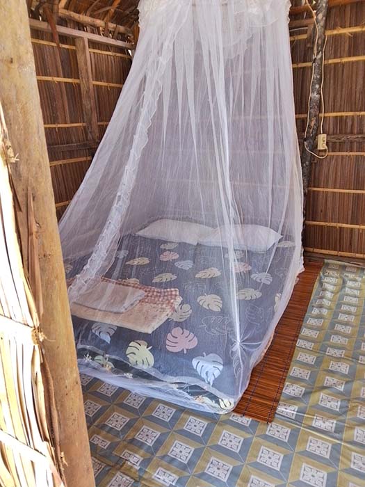 Blacktip Homestay offers three private beach bungalows. The bungalows sleep two on mattresses on the floor. Sheets, pillows, bolsters and mosquito nets are supplied. Bungalow bedrooms are equipped with light switches and power outlets for charging devices.