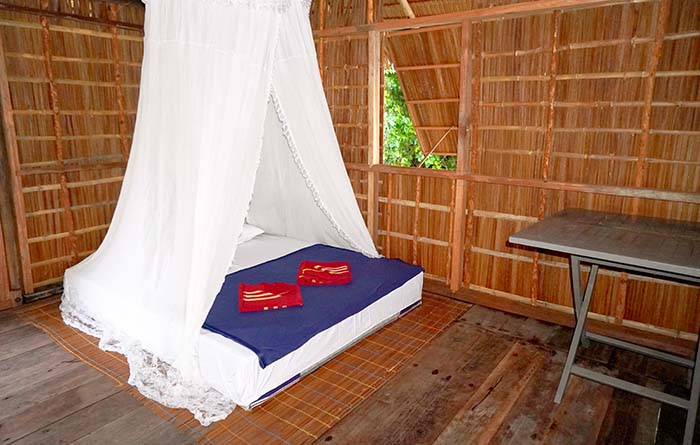 Citrus Homestay sleeps two on a mattress on the floor. The usual mosquito net and bedding are provided, and room light switches and power outlets for charging devices are fitted.