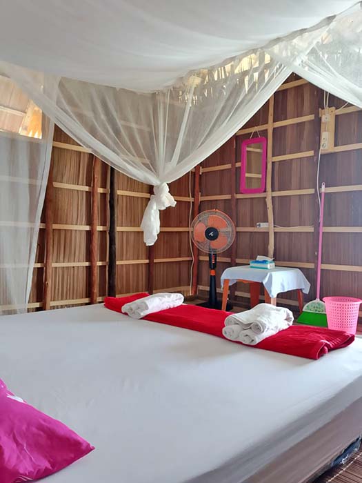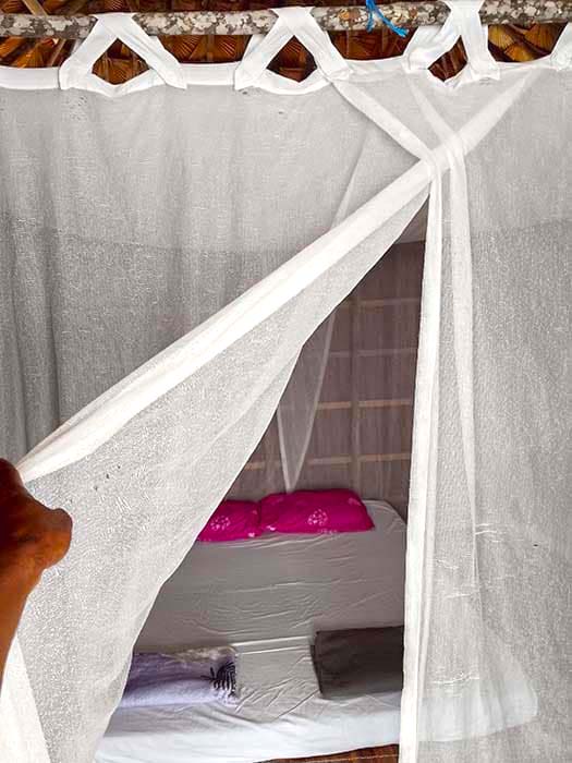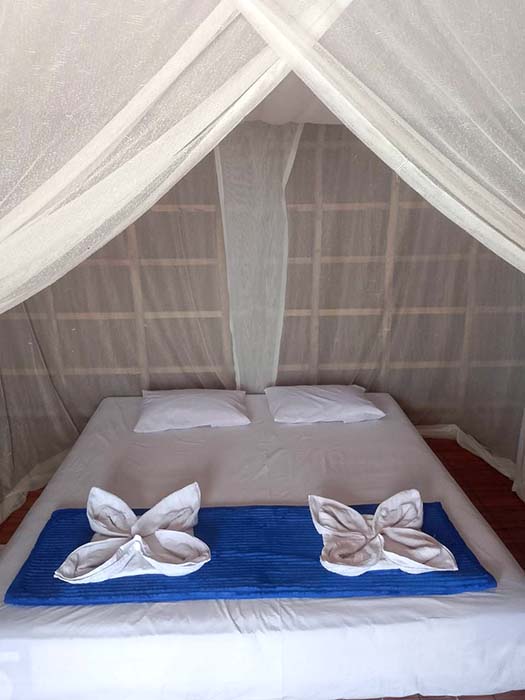 Bedding in all bungalows includes sheets, pillows, bolsters and mosquito nets. Bungalow verandahs have a table, chairs and ocean views.
