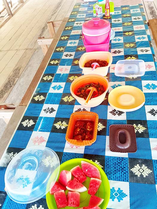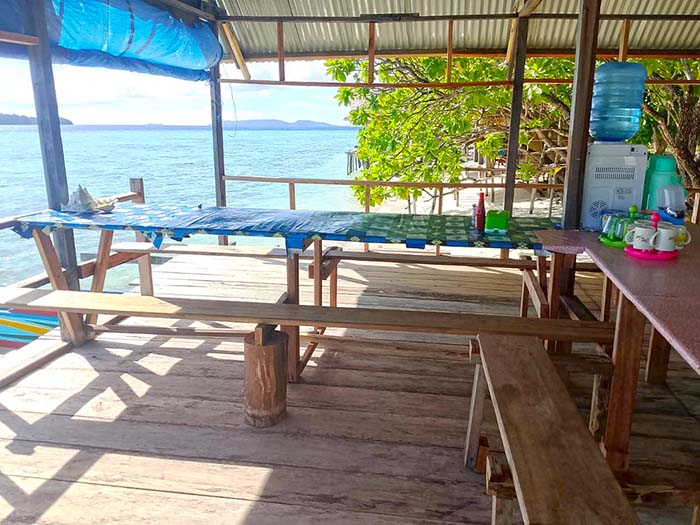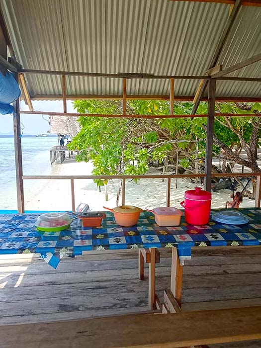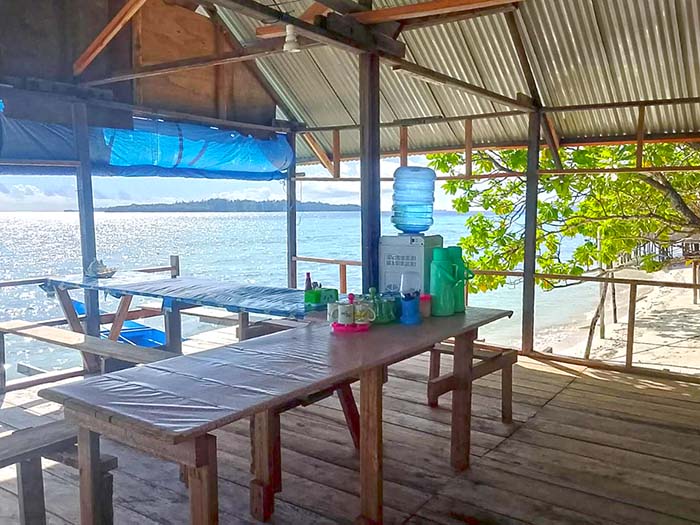 Meals are served in Coco Hut’s beachside dining shelter. In March 2024, Coco Huts was a new homestay with a temporary dining shelter: A trestle table and bench seating on the beach are covered by a stretched tarpaulin. Free drinking water, tea and coffee making supplies are provided there for guests. A more permanent structure will be built when resources permit.