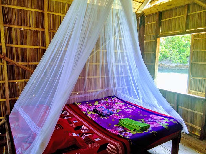 Kordiris Dive Homestay has six over-water and two beach private bungalows. All the bungalows are a single room with covered verandah at the front. The bungalows sleep two on a raised bed equipped with covers, pillows, bolsters and mosquito net.