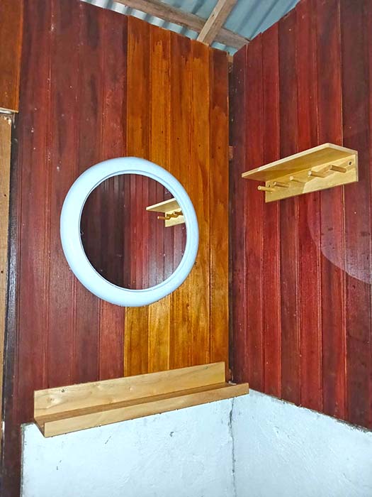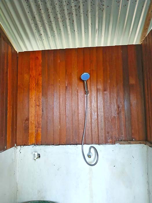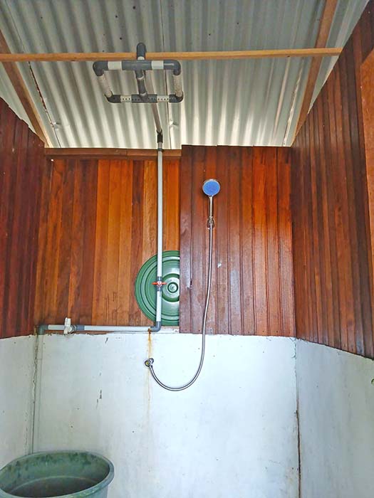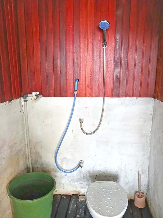 Guests share a four-room bathroom building on land. Two rooms have western-style toilets, and two have bucket bathing and showers.