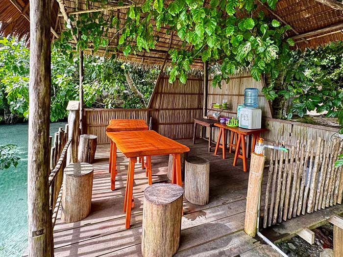A boardwalk connects Mandum’s bungalows to a dining room, where meals are served above the beach. The dining room also has lovely views, and free drinking water, tea and coffee are always available to guests there.