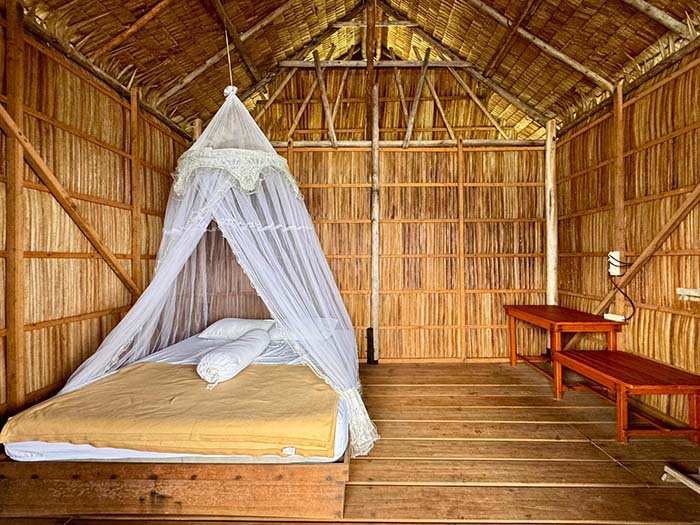 All bungalow bedrooms sleep two. All except one has raised beds. Bedding provided includes sheets, blanket, pillows, bolsters and mosquito nets. Towels are also supplied, and all rooms are fitted with light switches and power outlets.