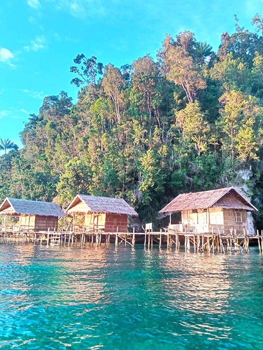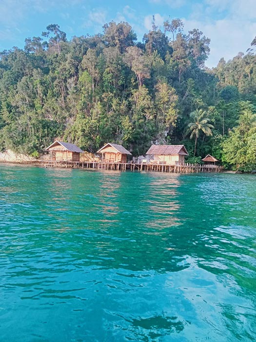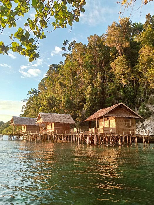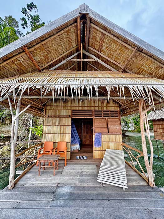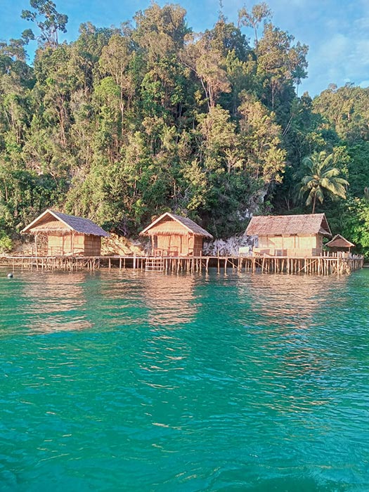 Mandum Stay is built above a tiny sliver of beach at the mouth of a jungled ravine in the entrance to Waigeo’s Kabui Bay.