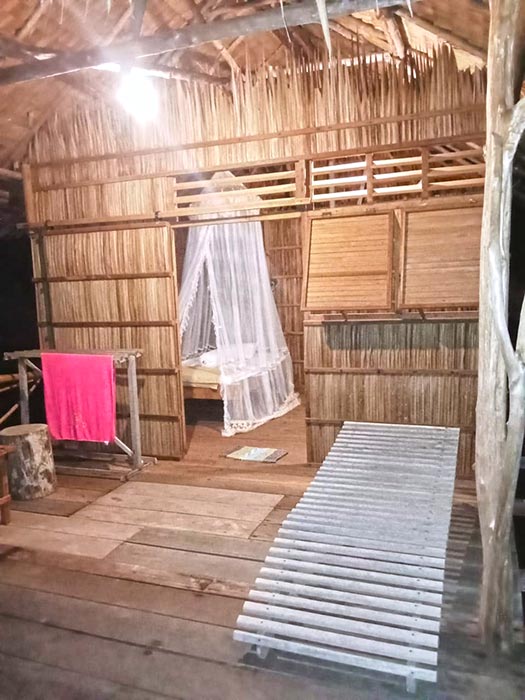 All bungalow bedrooms sleep two on mattresses on the floor. Bedding provided includes sheets, blanket, pillows, bolsters and mosquito nets. Towels are also supplied, and all rooms are fitted with light switches and power outlets.