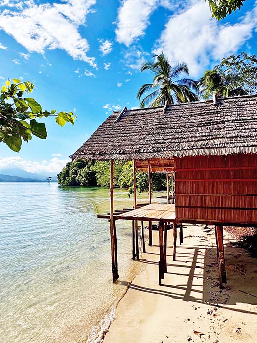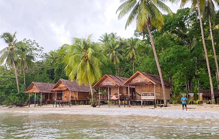 Four private beach bungalows occupy an eastward facing cove opposite Pulau Boni. A freshwater stream emerges from the wildlife-rich jungle behind the homestay. Low tide reveals a wide, sandy beach.