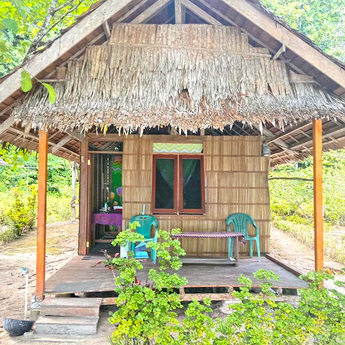 The tree-shaded bungalows are set a little back from the beach. The covered bungalow verandahs are equipped with a small table and chairs.