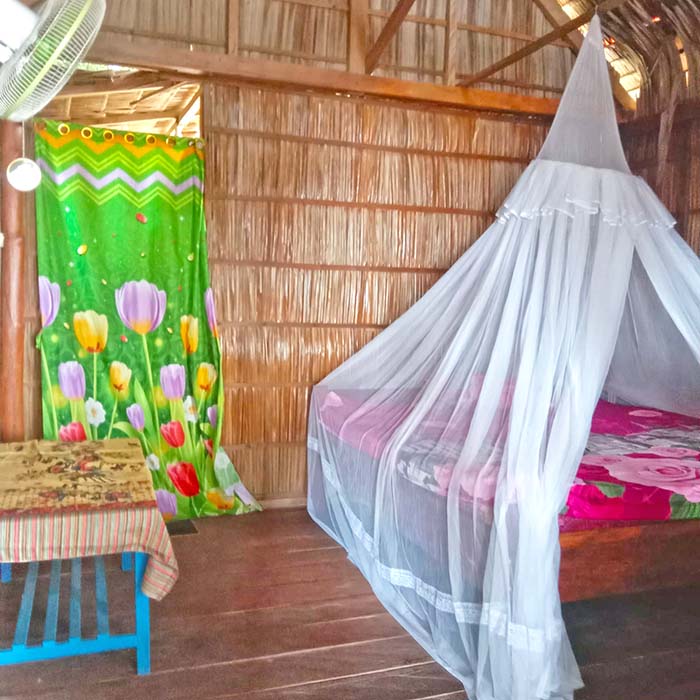 The bungalows sleep two on raised double beds and have western style toilets and showers in their ensuite bathrooms. Mosquito nets, pillows, bed linen and bath towels are provided.