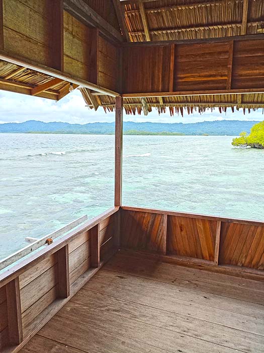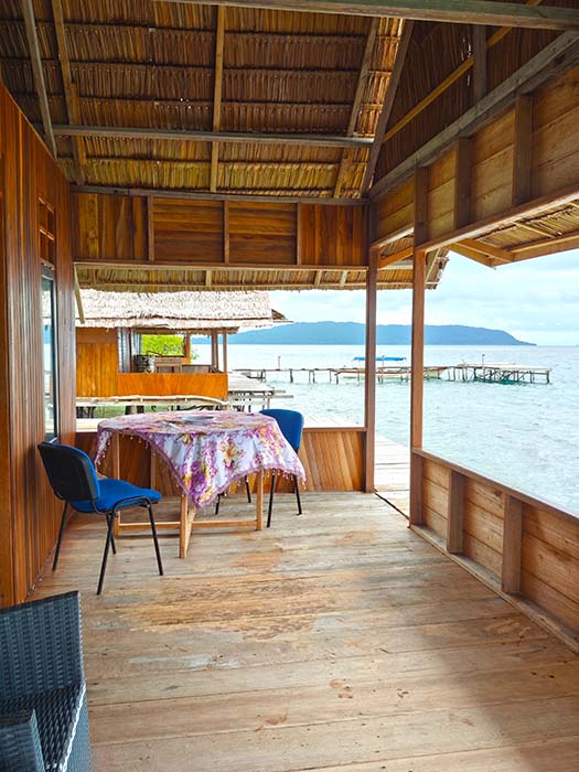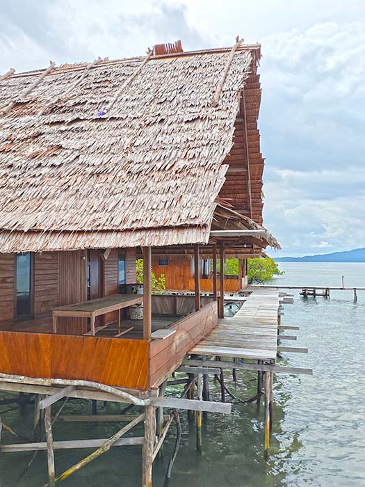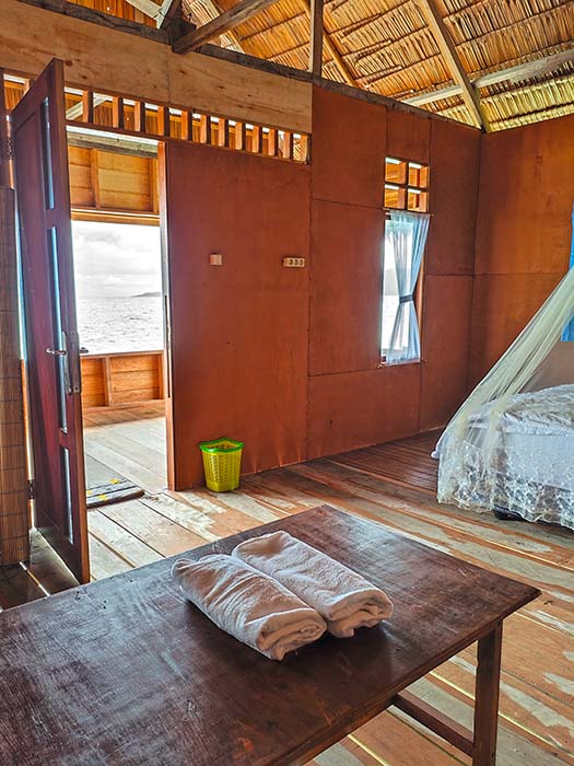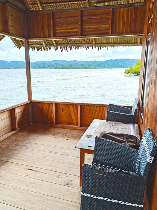 The bungalows have verandahs with tables and chairs and panoramic ocean views to Arborek, Mansuar and Batanta.