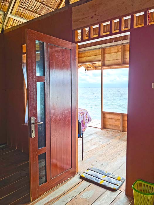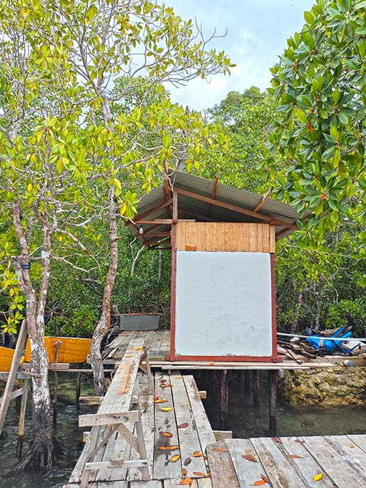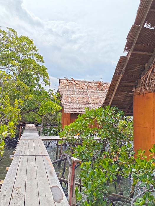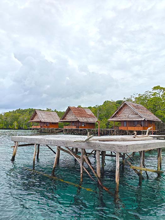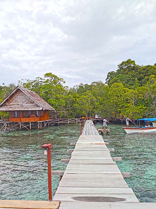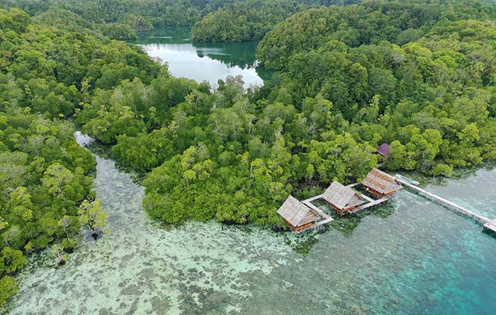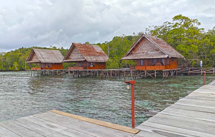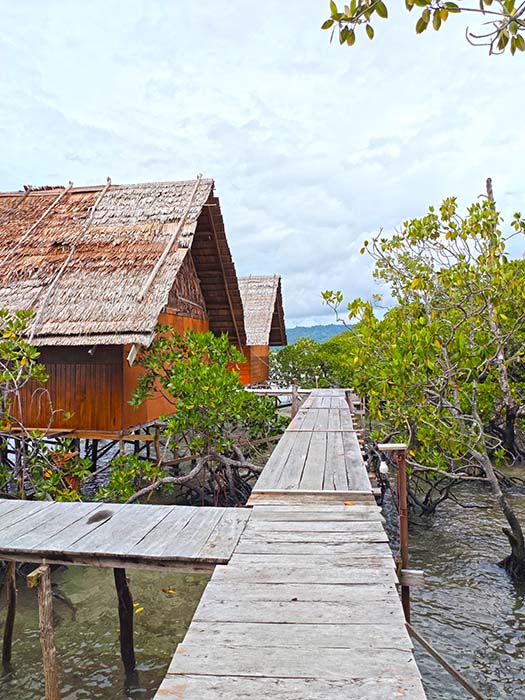 Raja Ampat Holidays Homestay offers three over-water family bungalows on a mangrove-lined shore near Kapisawar village on Pulau Gam.