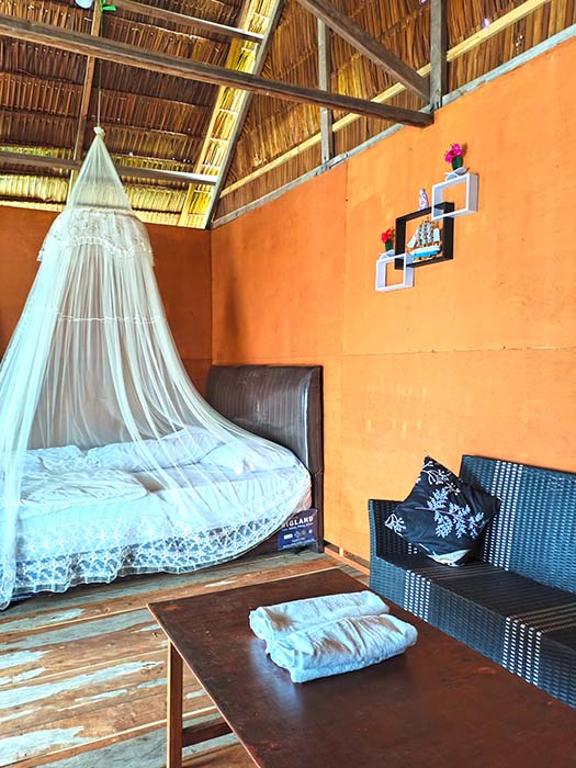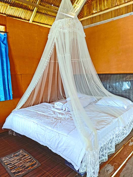 All bungalows sleep two people on raised beds. Pillows, bolsters, sheets and mosquito nets are supplied. Extra mattresses can be provided for up to 2 guests if required. All bungalows have power outlets for charging devices and bedroom light switches.