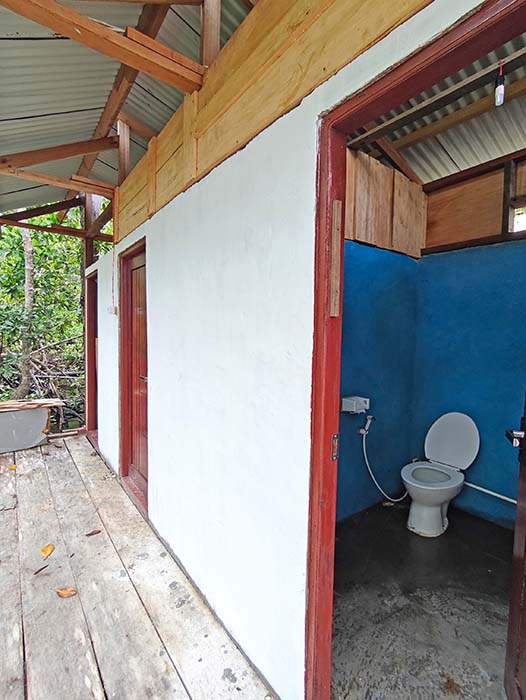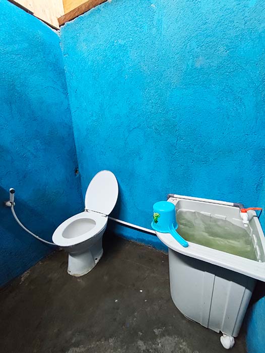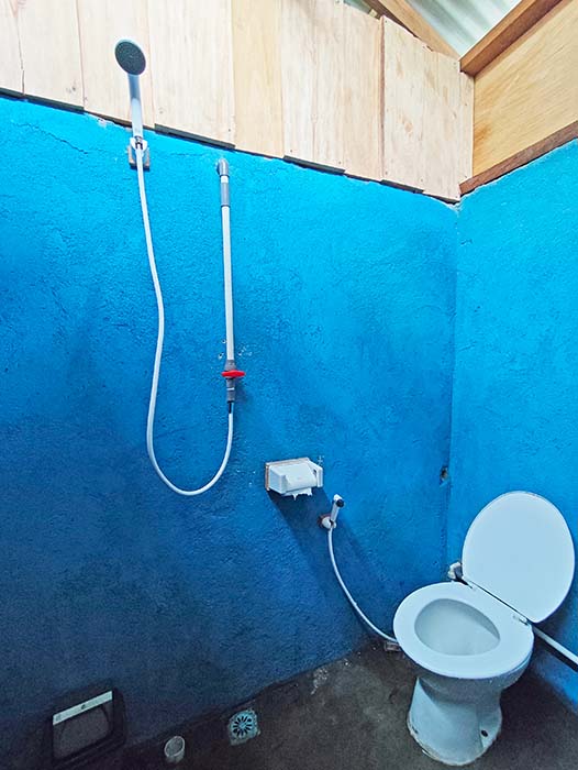 Guests share a three-room bathroom building. A western style toilet and squat toilet are provided. Showers are fitted, as well as bucket bathing for times when the electricity is not on.