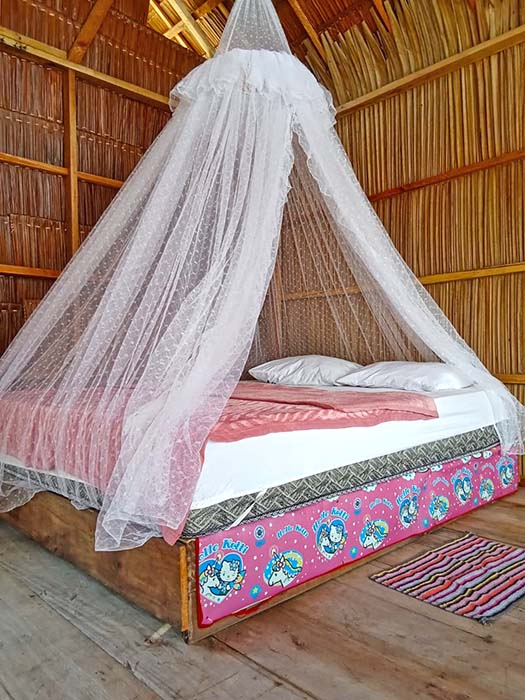 The bungalows sleep two. Bedding for a third guest can be provided if needed. Both bungalows will eventually have raised beds, but in March 2024, only one was available. The usual bedding and mosquito nets are supplied, and all rooms are provided with a small table, electrical outlets, and room light switches.