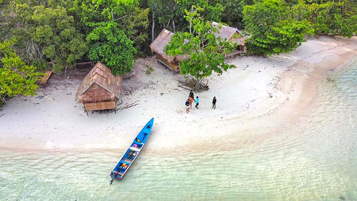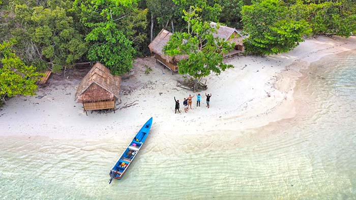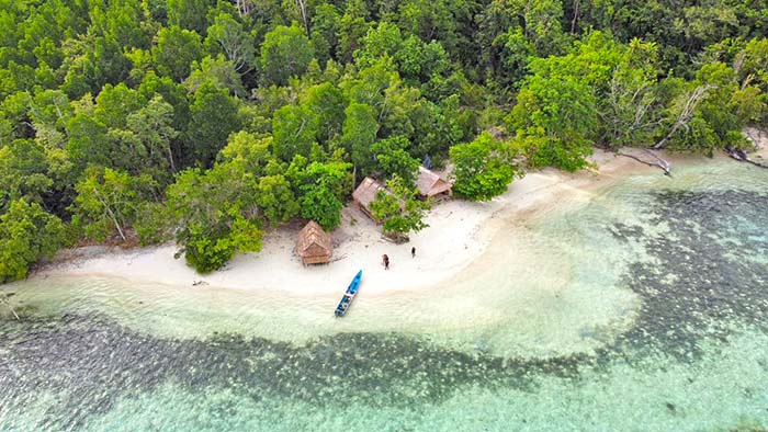 Sampari Paradise Homestay offers 2 private beachfront bungalows on the east coast of Pulau Rambau, near Batanta’s western end.