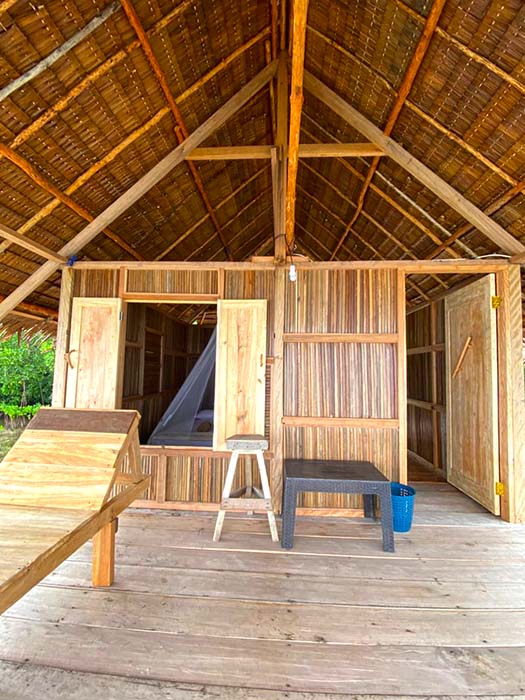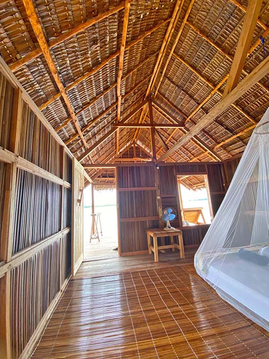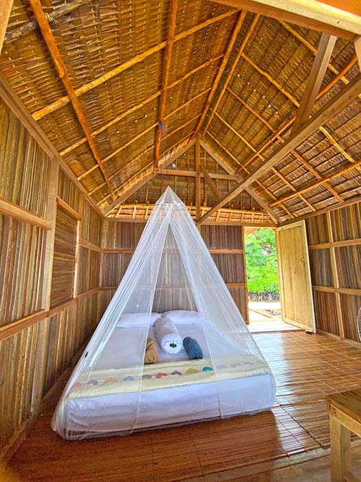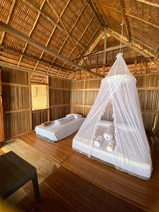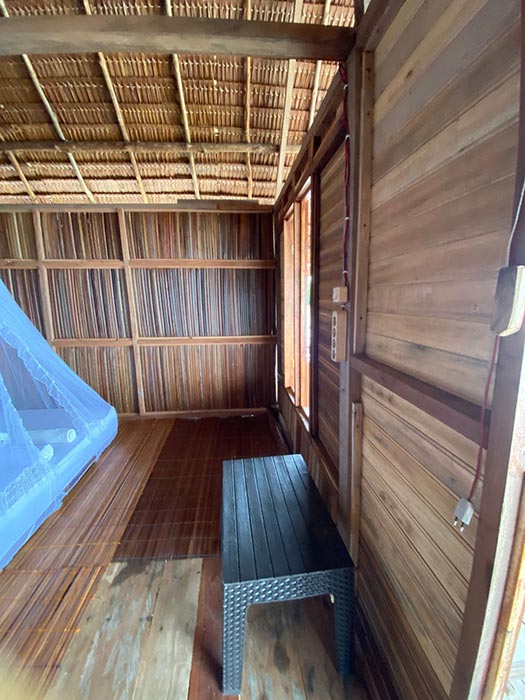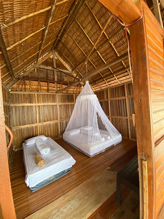The bungalows sleep two on inner spring mattresses on the floor. The usual bedding and mosquito nets are supplied, and all rooms have electrical outlets and room light switches. An extra mattress can be added for a third guest if required.