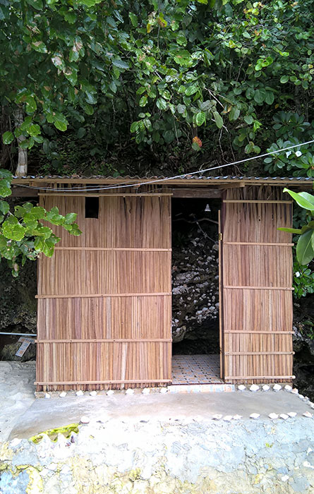 Guests share a tiled floor bathroom building that hugs the low cliffs behind the bungalow. The bathroom is accessed via a short boardwalk and has two rooms. A western style toilet occupies one, and bucket bathing and a shower is provided in the other.