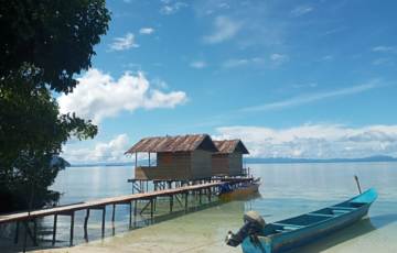 Dampier Strait and Batanta views from private beach bungalows on the southern shore of Pulau Arborek. Diving, mantas and village life all close at hand.